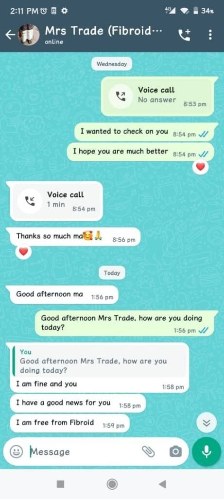 I’m Mrs. Blessing, and I want to share a story about my struggle with fibroids, which made it hard for me to become a mom. For four long years, I faced a lot of pain, heavy bleeding, and feeling really sad. Even the doctors couldn’t help much, and things seemed tough.